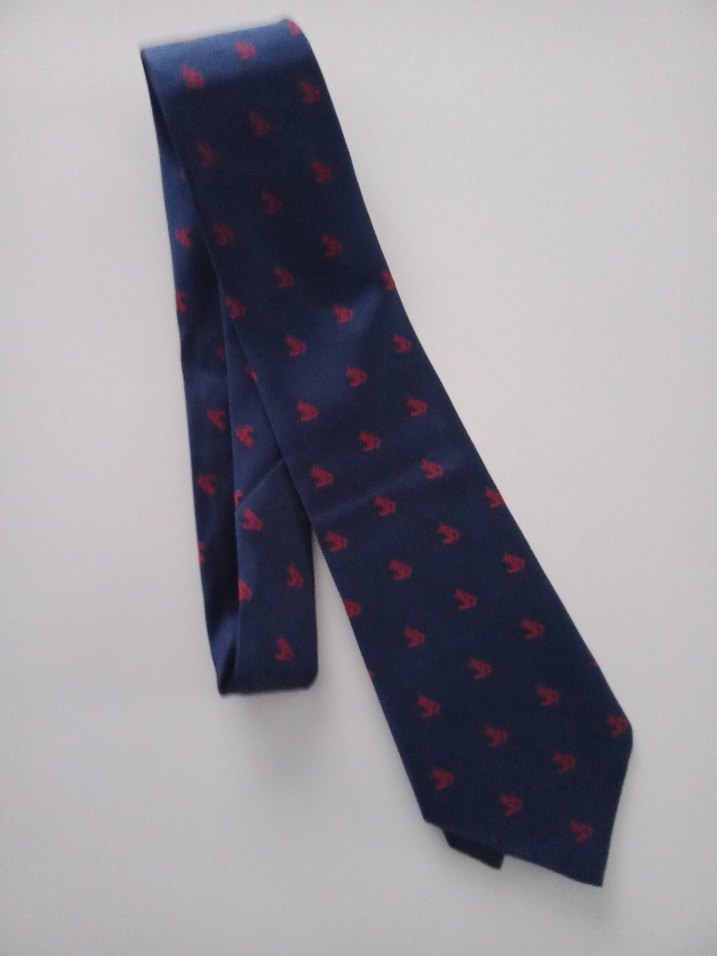 Koyu mavi zemin üzerine küçük kırmızı desenler bulunan erkek kravatı, iş ve sokak stili için uygundur. Sade ve temel tasarım.