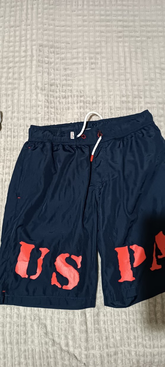 Koyu mavi renkli, bol kesim ve mini boy erkek plaj şortu. Kemerli ve kırmızı "US" baskılıdır, sahil için uygundur. sadece belindeki ip çıkıs yerleri biraz acıldı,kullanıma engel değil,yesyeni duruyor,bel esnemeden 38.5 cm,boy 51,paça 28 cm,içi fileli