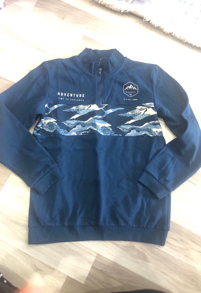 Koyu mavi renkte, yüksek yakalı ve fermuarlı erkek sweatshirtü. Yumuşak ve sıcak kumaştan, bol kesim. Dağ desenleri ve "ADVENTURE" yazısı bulunur. ️