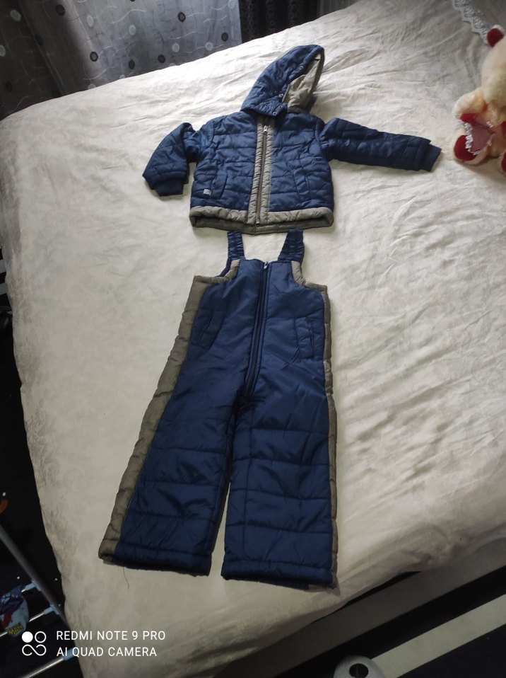 Koyu mavi renkli, kapüşonlu ve fermuarlı ceket ile uyumlu askılı pantolonlardan oluşan bebek erkek kayak tulumu. Yumuşak ve sıcak kürk astar içerir, desensiz sade tasarım. ❄️