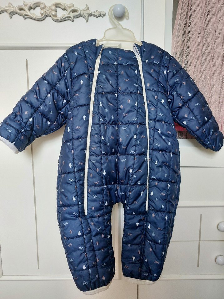 Yumuşak ve sıcak kumaştan yapılmış, fermuarlı koyu mavi bebek tulumu. Rahatlık ve sıcaklık için sade tasarım. ❄️