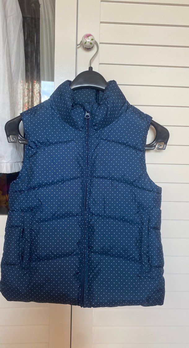 Koyu mavi, fermuarlı, yüksek yakalı ve kolsuz çocuk şişme yelek. Sentetik kumaştan, normal boyda ve ince kesim. Hafif puantiyeli deseniyle günlük sokak tarzına uygun.