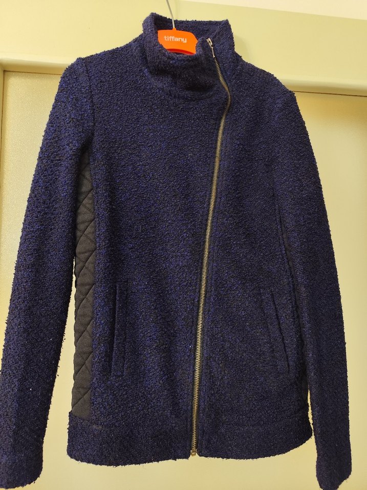 Koyu mavi renkli, fermuarlı ve fitted kesim kadın ceket. Notch yakalı, uzun kollu ve yumuşak dokulu, günlük kullanıma uygun.