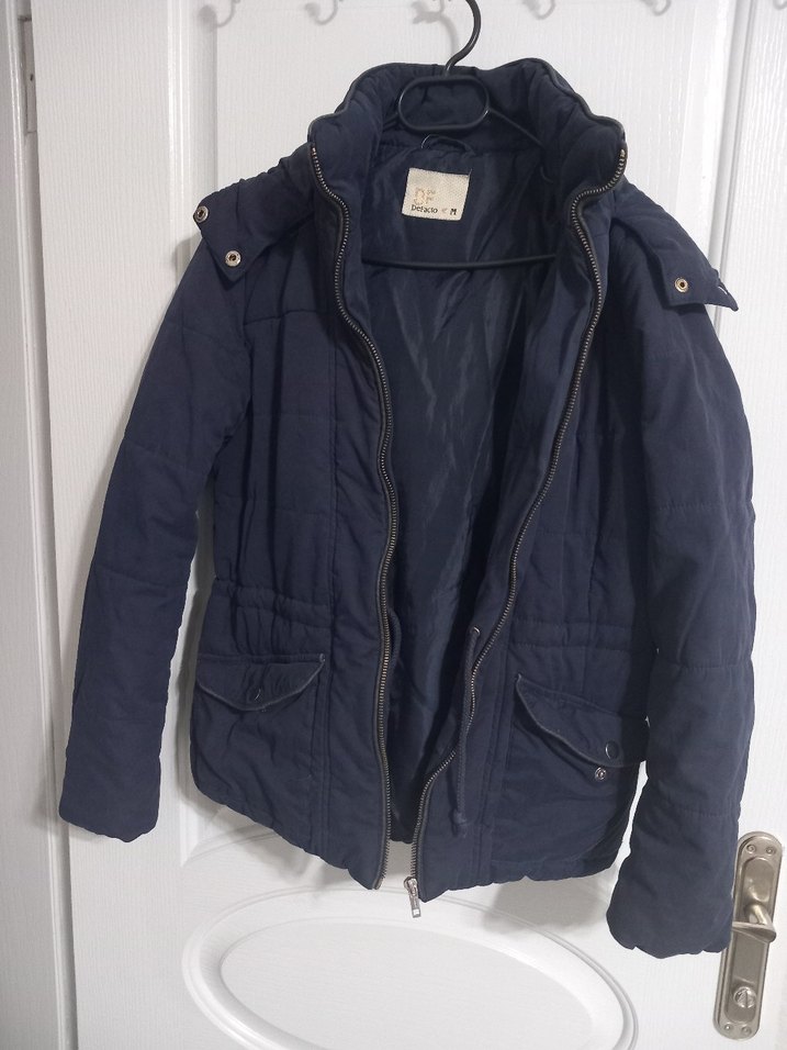 Koyu mavi renkte, fermuarlı ve kesimli bir kadın mont. Yumuşak ve sıcak kumaştan, günlük rahat sokak giyimi için uygundur.