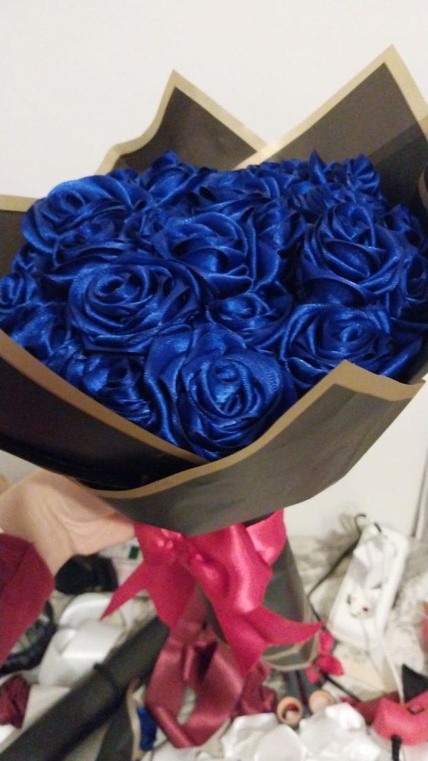 Koyu mavi güllerden oluşan, siyah ve kahverengi kağıda sarılı, kırmızı kurdeleli buket kendim yapıyorum gerçekten çok güzel