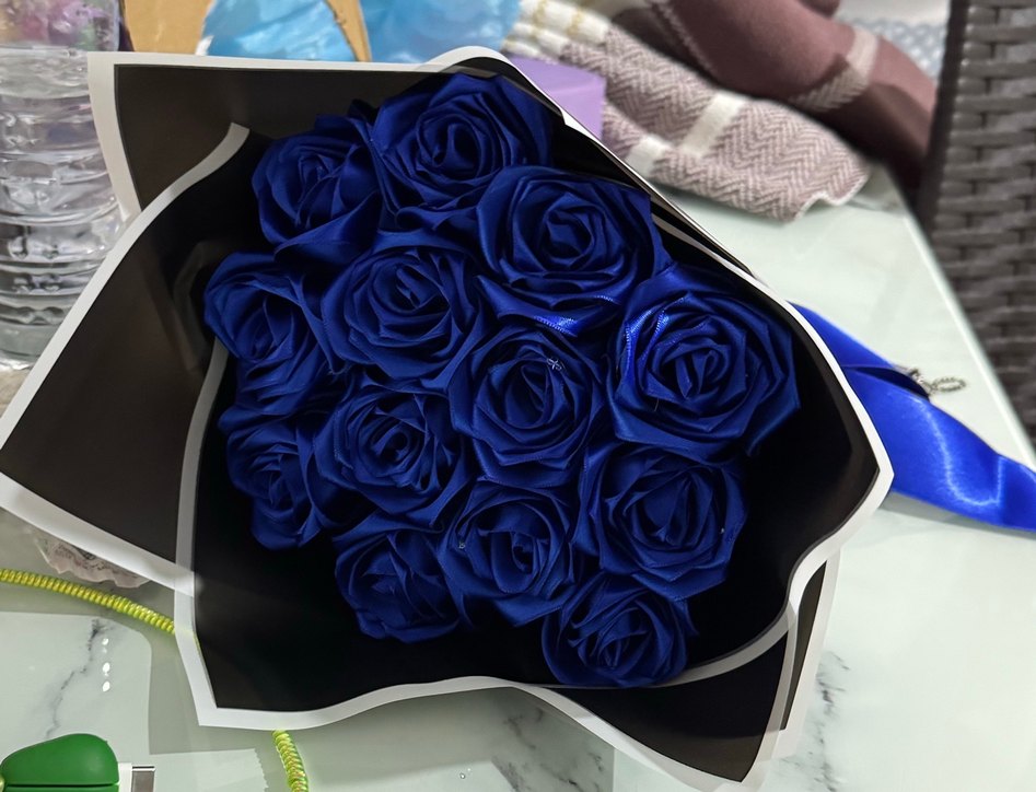 Zarifçe düzenlenmiş koyu mavi güllerden oluşan buket, hediye veya dekorasyon için uygundur.