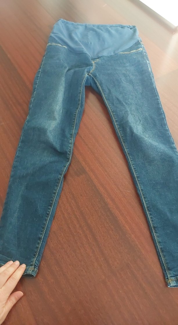 Koyu mavi renkli hamile denim pantolon, orta boy ve regular fit kesime sahiptir. Günlük kullanıma uygun, tokalı detaylı rahat bir modeldir. bel kisminda hafif lekelrr var fotoda var