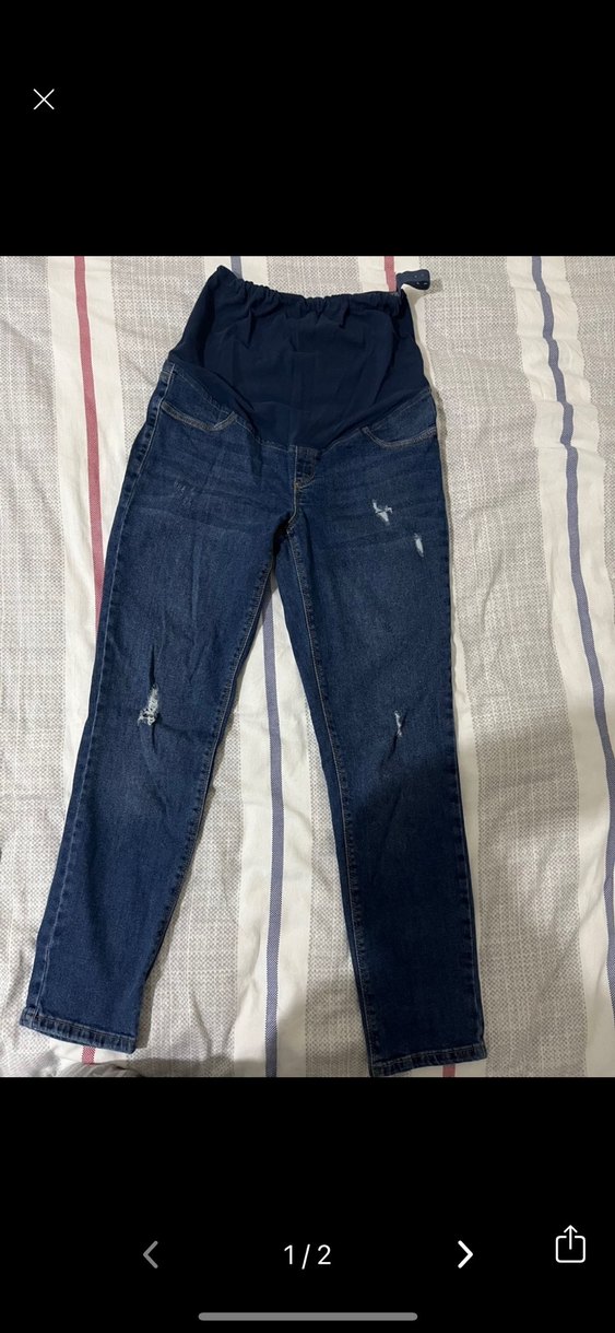 Koyu mavi denim hamile kot pantolon, normal boy ve regular kesim. Bel kısmı lastikli sorunsuz ve temizdir