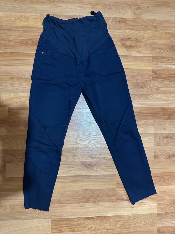 Koyu mavi hamile kot pantolon, dar kesim ve midi boy ile rahat ve şık bir günlük kullanım sunar.