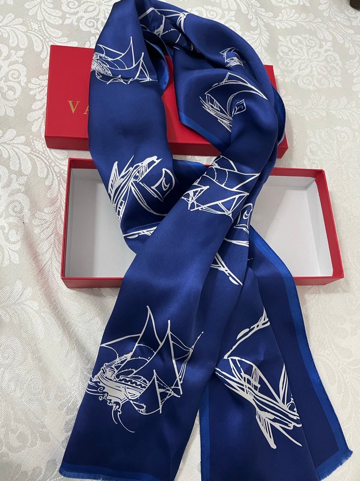 Koyu mavi renkli, ipek dokulu ve kurdele detaylı bu fular, klasik Paris tarzını modern çizgilerle buluşturuyor.