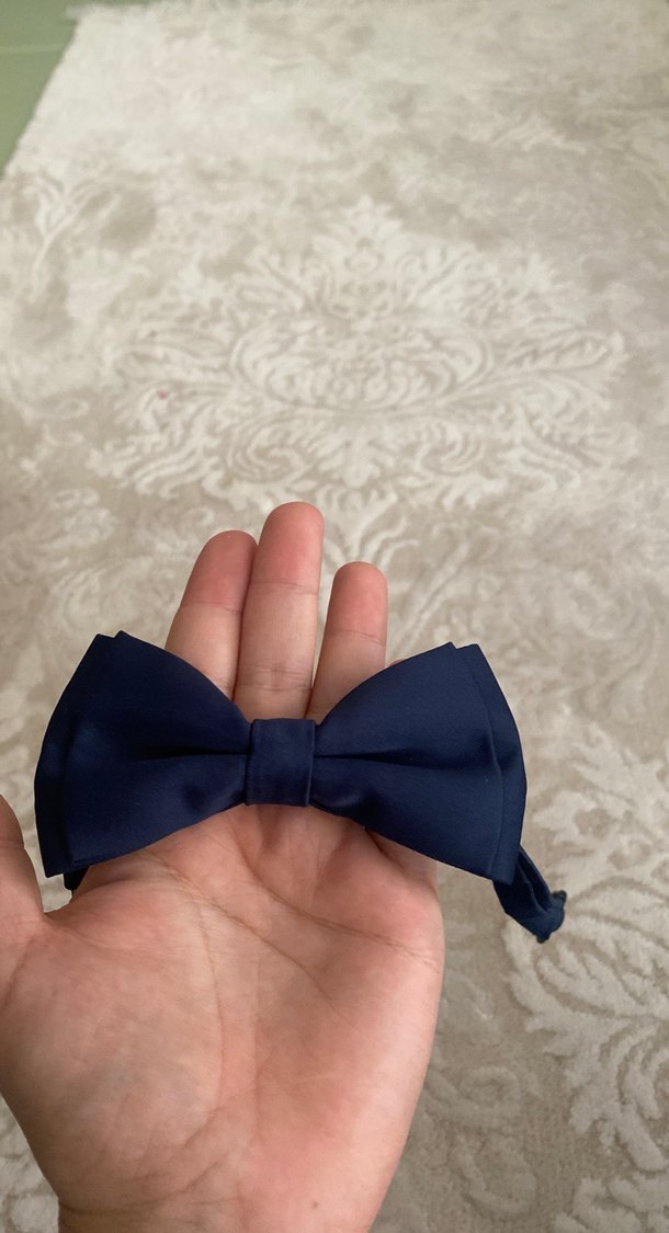 Düz, gotik tarzda, koyu mavi ipek papyon. Kumaşı yumuşak ve desensiz, sade ama şık görünüm sağlar.