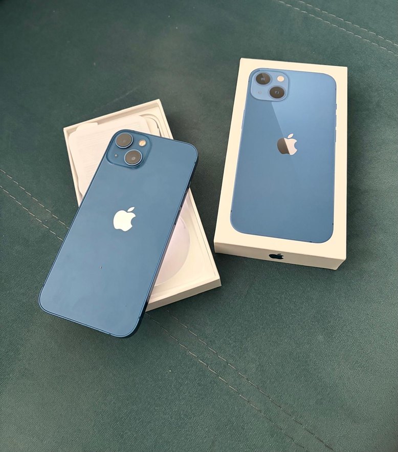 Koyu mavi renkte iPhone 13, arkada çift kamera ve Apple logosu ile şık bir tasarıma sahiptir.