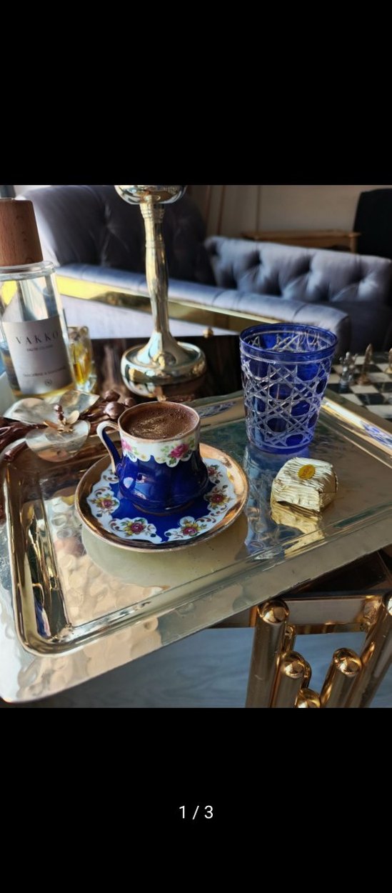 Çiçek desenli koyu mavi Türk kahvesi fincanı ve tabağı ile detaylı işlemeli koyu mavi bardak, yansıtıcı gümüş tepsi üzerinde sunulmuştur. ☕ ikili fincan saray fincanı