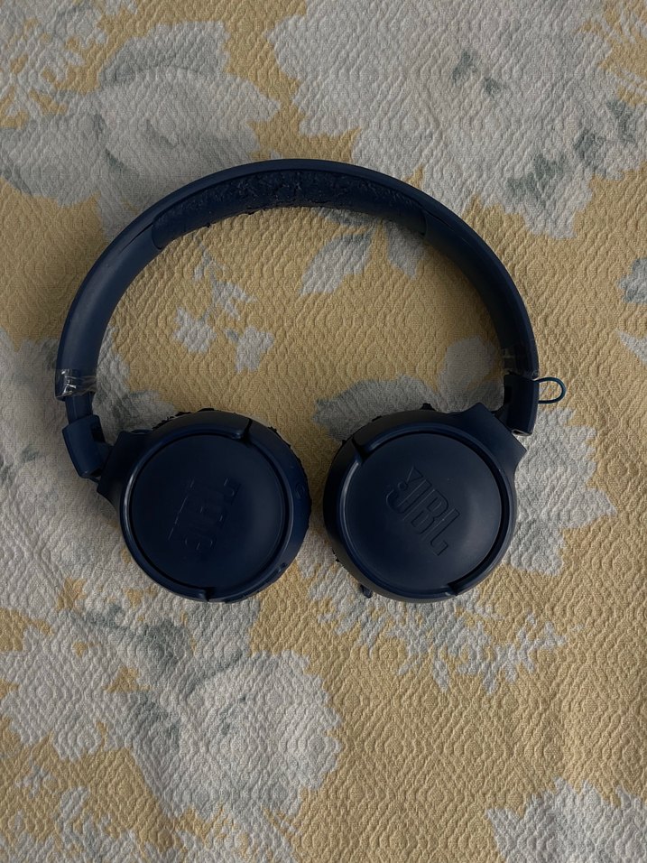 Koyu mavi JBL kablosuz kulaklık, yumuşak kulak yastıkları ve ayarlanabilir kafa bandı ile konforlu kullanım sağlar .hasarlı bozuldu diye kablo eklettim sadece dersiniz değiştirerseniz çok güzel olur
