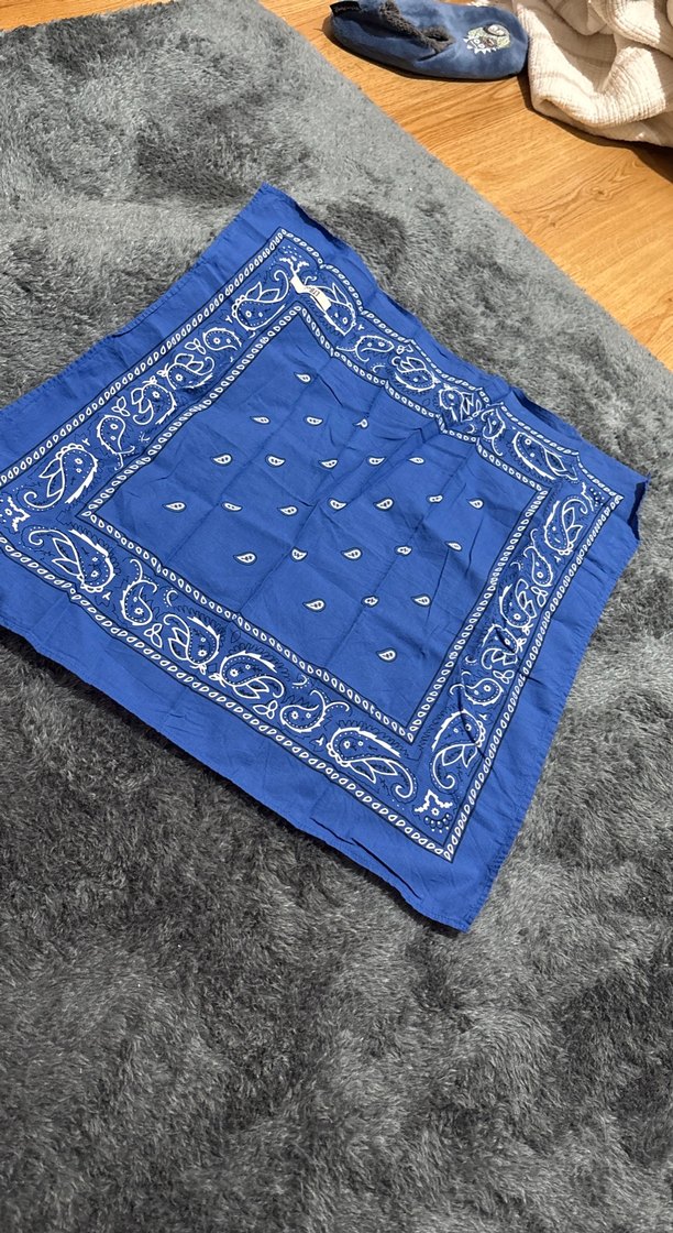 Koyu mavi renkte, klasik paisley desenli kadın bandana eşarp, yumuşak kumaştan ve tüylü detaylı, rahat ve retro tarzda.