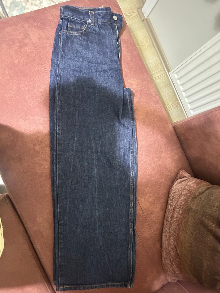 Koyu mavi , normal boy midi uzunlukta, rahat kesim kadın denim pantolon. Günlük kullanıma uygun, sade ve şık bir sokak stili sunar.