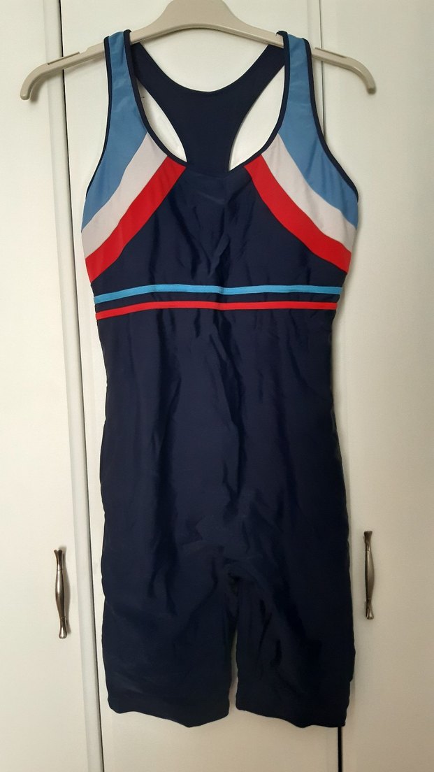 Koyu mavi renkte, renkli şerit detaylı, kolsuz, spor tarzda kadın mayo. Fitted kesimiyle rahat ve şık bir seçimdir.