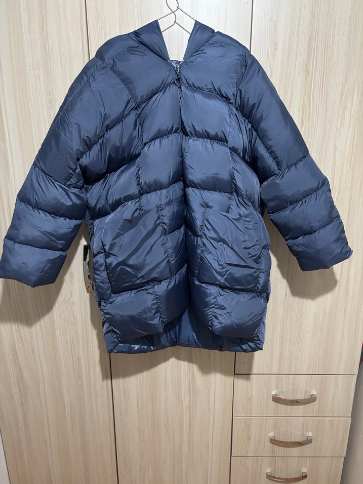 Koyu mavi renkte, sentetik kumaştan yapılmış, fermuarlı, normal boy ve dar kesim kadın kış kabanı. Uzun kollu ve notched yaka detaylı, rahat normcore tarzda günlük kullanım için uygun.
