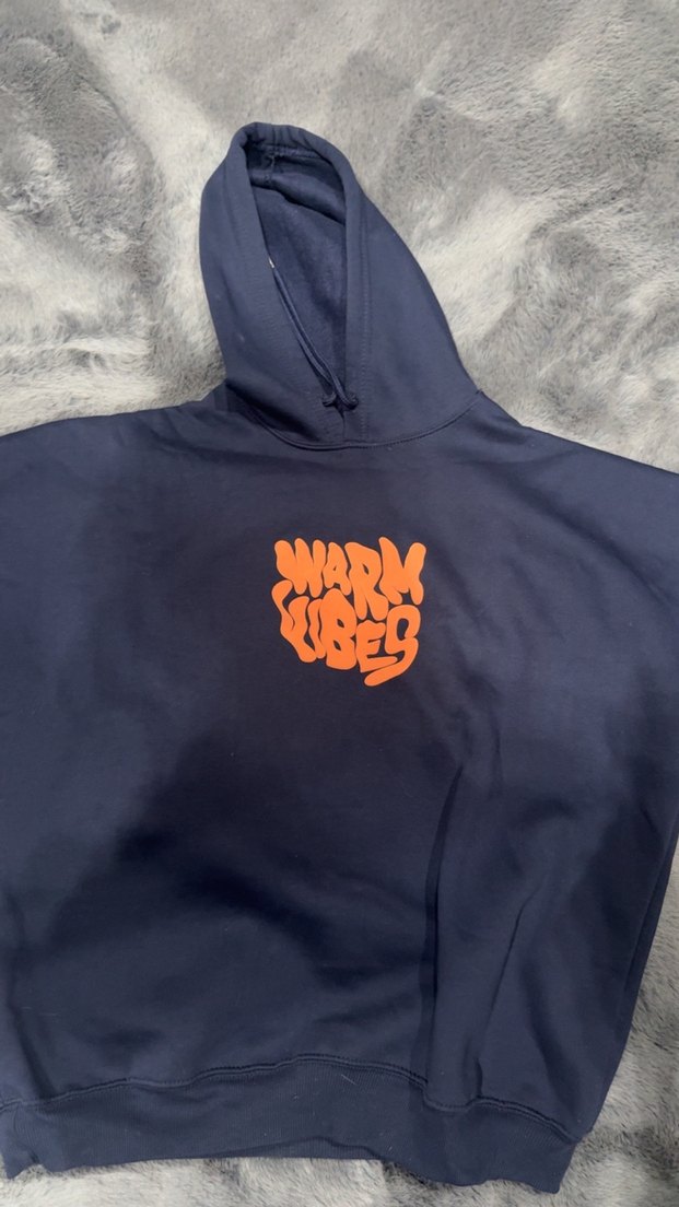 Koyu mavi kapüşonlu sweatshirt, uzun kollu ve bol kesimdir. Yumuşak ve sıcak kumaştan üretilmiştir. Göğsünde turuncu 'Warm Vibes' baskısı vardır, günlük kullanıma uygundur.