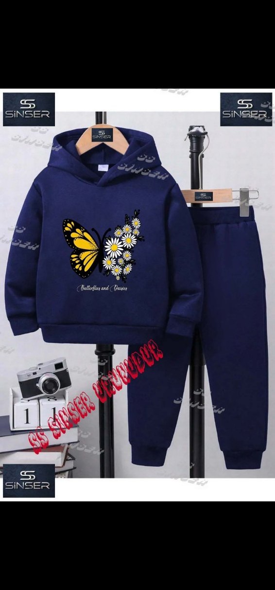Koyu mavi kapüşonlu sweatshirt ve düğme detaylı, kelebek ve papatya baskılı, rahat keçe kumaş eşofman altı ile regular fit tarzda erkek çocuk takımı.
