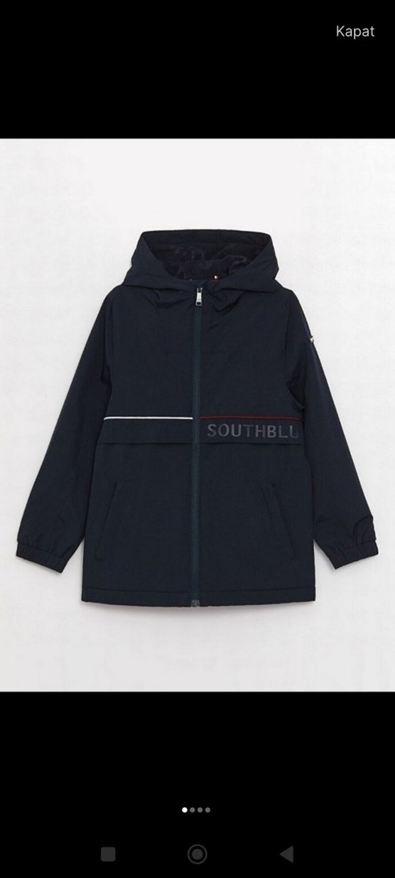 Koyu mavi kapüşonlu erkek çocuk ceketi, kemerli ve rahat kesimlidir. Yumuşak ve sıcak kumaştan üretilmiştir. Üzerinde 'SOUTHBLL' yazısı bulunur.
