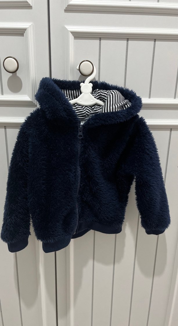 Koyu mavi renkte, kapüşonlu ve kürk detaylı, ince kesim erkek bebek mont