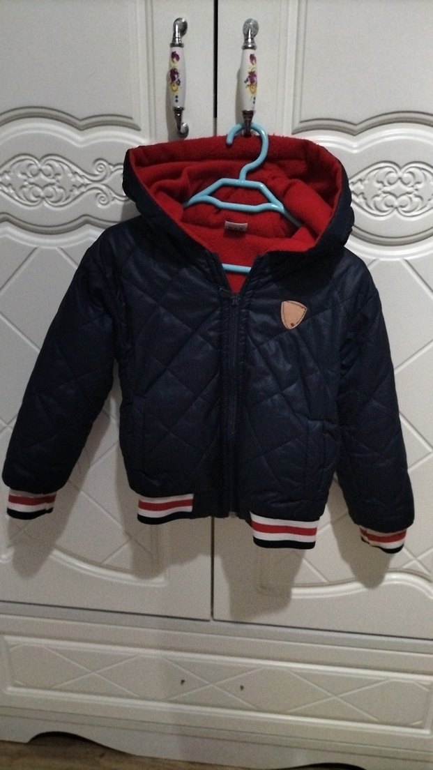 Kapüşonlu, fermuarlı, yumuşak ve sıcak kumaştan yapılmış koyu mavi dış yüzeyli ve kırmızı astarlı erkek çocuk montu. Rahat sokak stili için uygundur.
