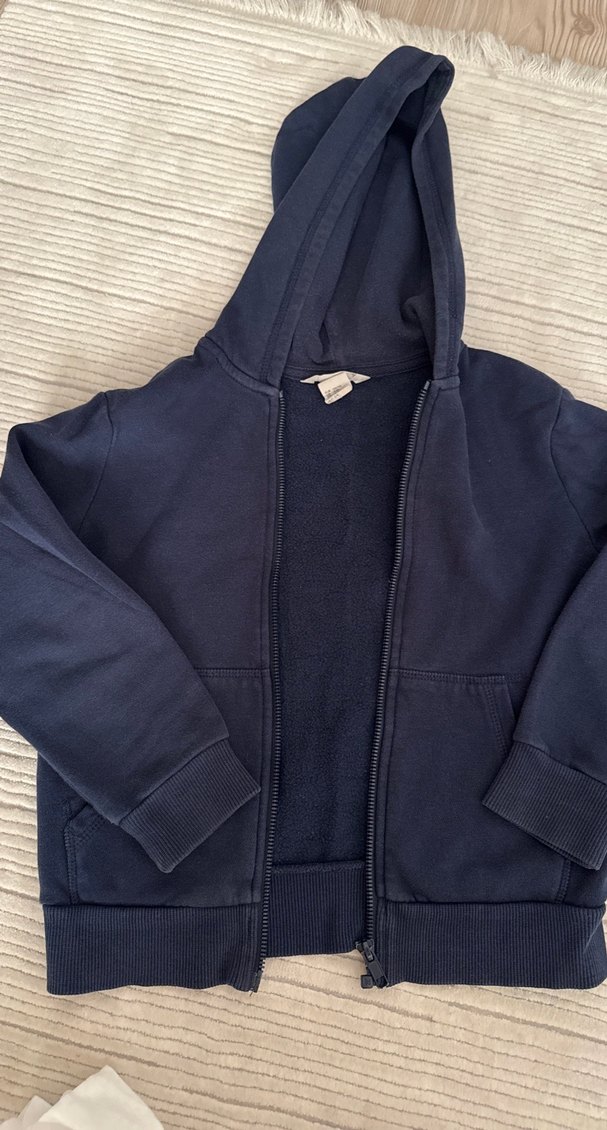 Koyu mavi, kapüşonlu ve fermuarlı, yumuşak ve sıcak kumaştan erkek çocuk sweatshirtü. Uzun kollu, sade ve desensiz tasarım.