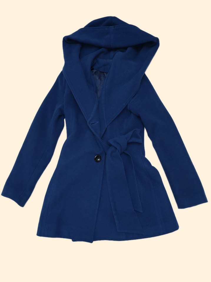 Büyük kapüşonlu ve kemerli. Tek düğmeli kapama var. sadece iç astarında iplik çıkmaları var. ağır bir kaban, sıcak tutar. M beden yazıyor ama s'ye ve xs-s arasındakilere olup.