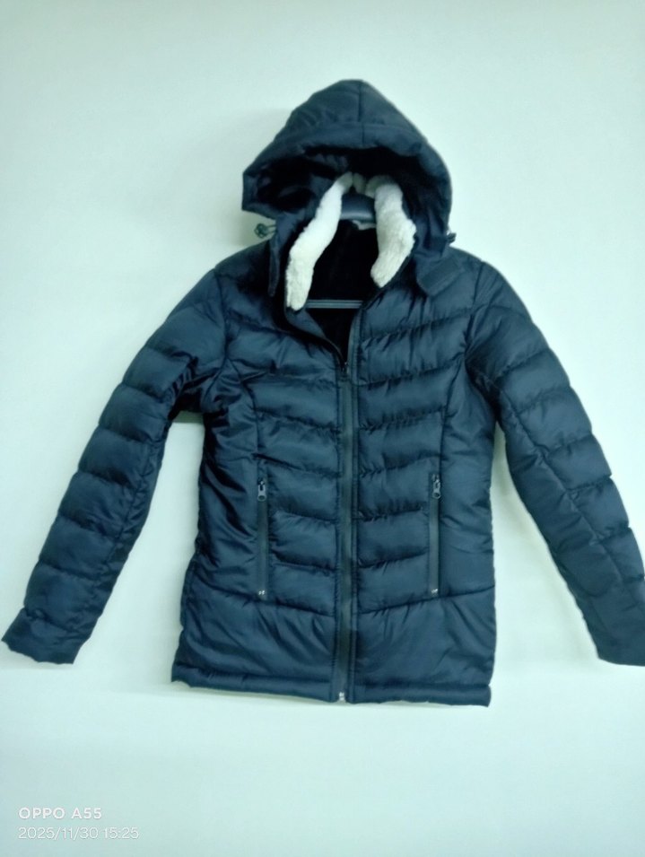 Koyu mavi renkli, fermuarlı ve kapüşonlu kadın kış montu. Uzun kollu, notched lapel yakalı, midi boy ve rahat yumuşak iç astarlı, günlük kullanıma uygun.
