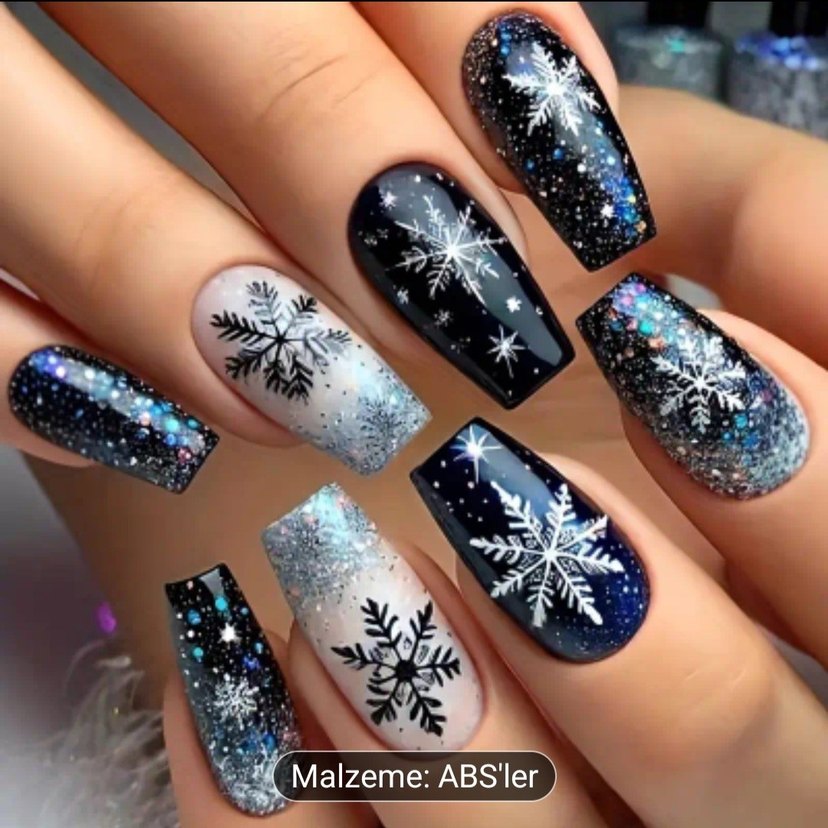 ABS malzemeden yapılmış, kar tanesi desenli koyu mavi tırnak süsleri ❄️.