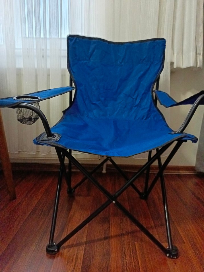 Yeni gibi çok az kullanıldı Koyu mavi katlanabilir Kamp sandalyesi, kol dayama ve bardak tutucu özellikleriyle taşınabilir ve rahat kullanım sağlar.