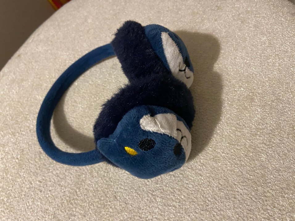 Koyu mavi, yumuşak peluş kumaştan yapılmış, her kulakta sevimli işlemeli yüzler bulunan kedi kulaklığı. Rahat ve sıcak tutar.