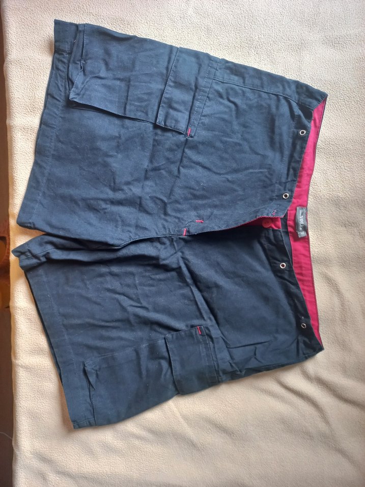 Koyu mavi renkte, kemerli ve cepli denim bermuda şort. Bol kesim ve midi boyda, rahat sokak stili ve outdoor kullanıma uygun.