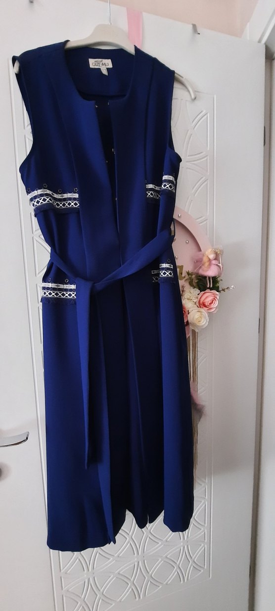 Koyu mavi renkli, kolsuz uzun , işlemeli detaylara ve kesik yaka tasarımına sahiptir. Kemerli, düz kesim ve sentetik kumaştan üretilmiştir.