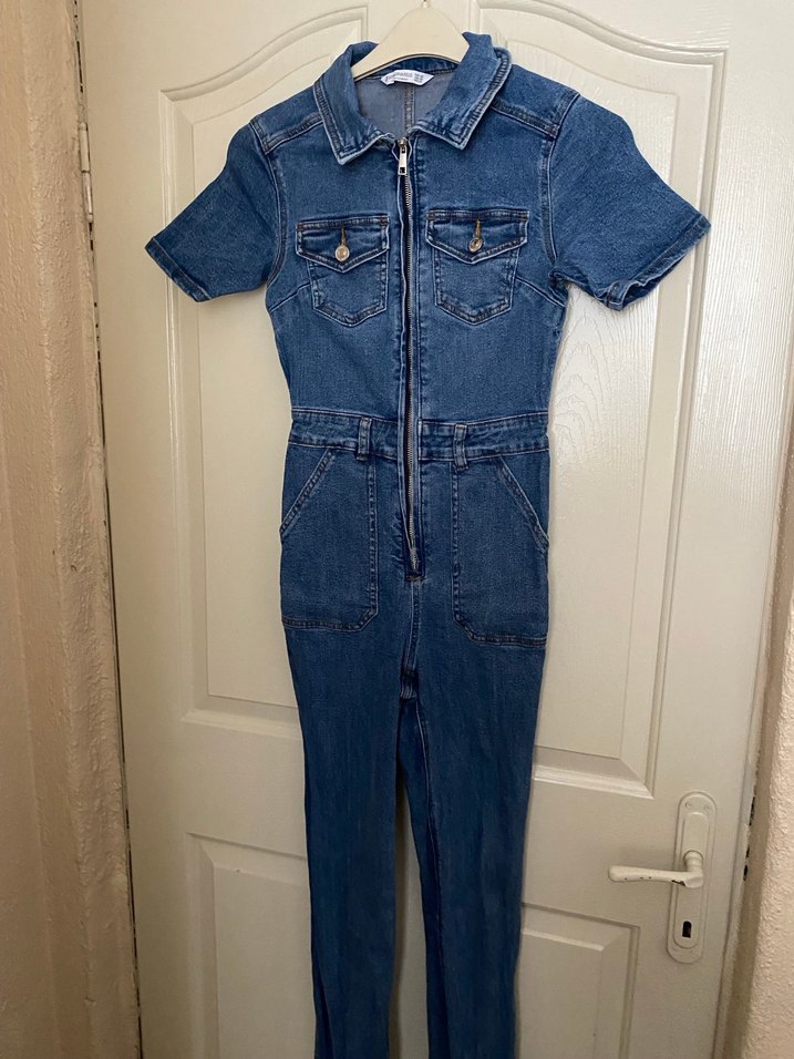 Koyu mavi renkte, kısa kollu, önü fermuarlı ve yakası kesik detaylı, günlük kullanıma uygun, fitted kesim denim tulum.