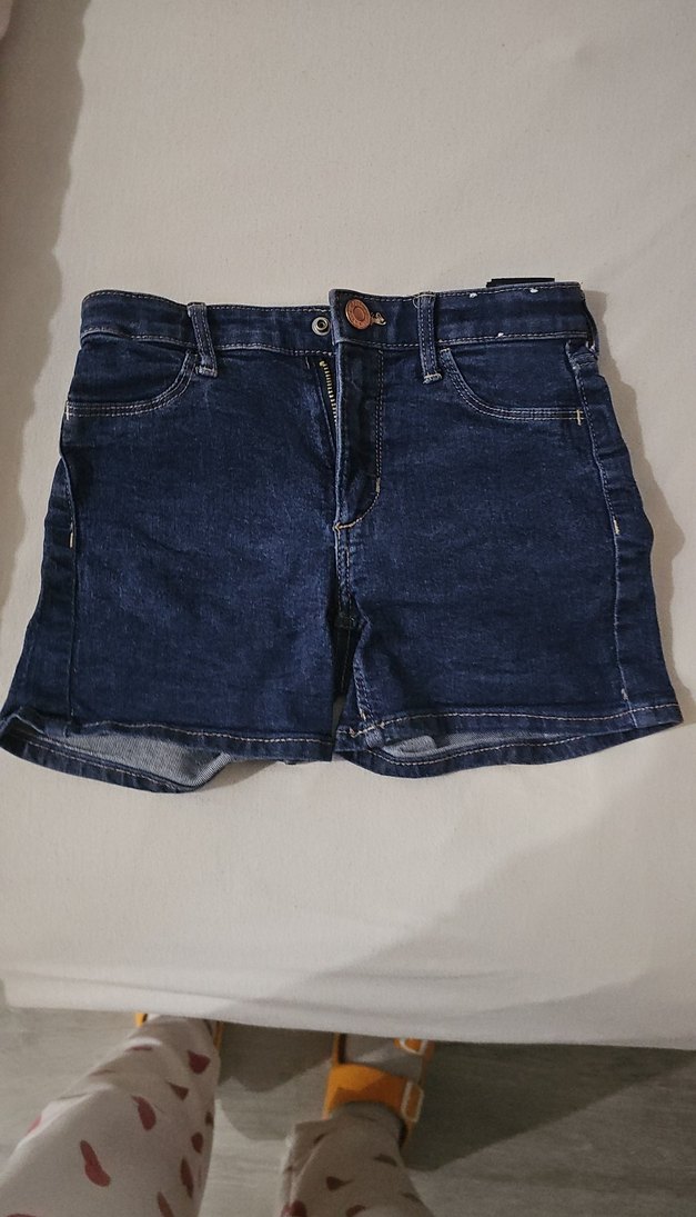 Koyu mavi, düğmeli, fitted kesim kız kot şort, streetwear tarzına uygun.
