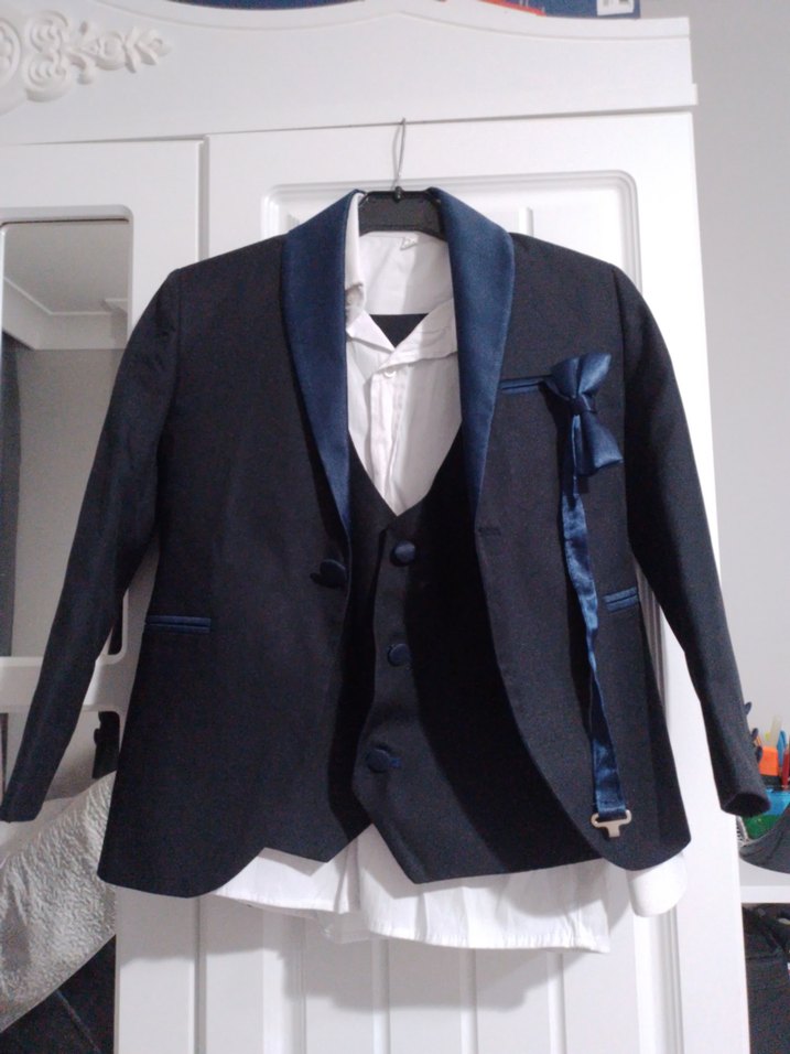Koyu lacivert renkte, klasik tarzda çocuk takım elbisesi. Kesimi regular fit, yakası kesik yaka, kemer detaylı ve askılı kolludur. sadece sünnet düğününde 1 kere kullanıldı.tertemizdir .papyon yelek gomlek pantolon ceket halidne tam takım. #erkekcocuktakimelbise #takimelbise #sünnetelbise