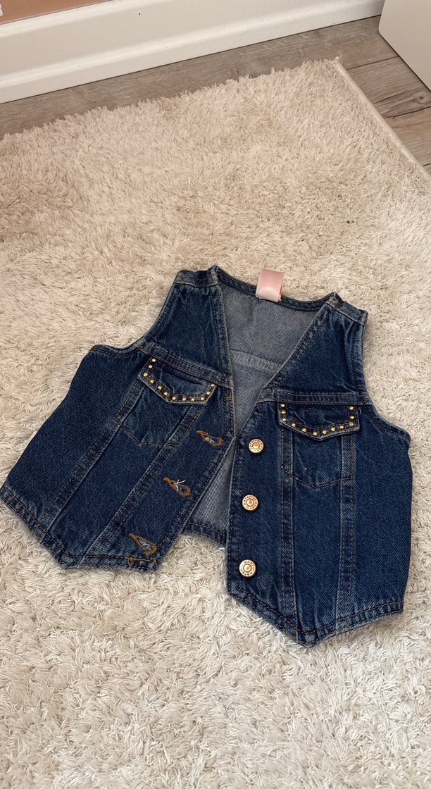 Koyu mavi renkte, kolsuz ve nakış detaylı kot yelek. Kürk detayları ve kesik yaka ile rock punk tarzına uygun günlük kullanım için ideal.