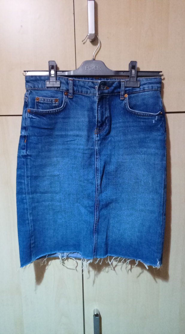 Koyu mavi kot kumaştan, belde tokalı, dar kesim midi etek. Eteğin altı hafif salaş ve desensiz, günlük sokak stili için uygun.
