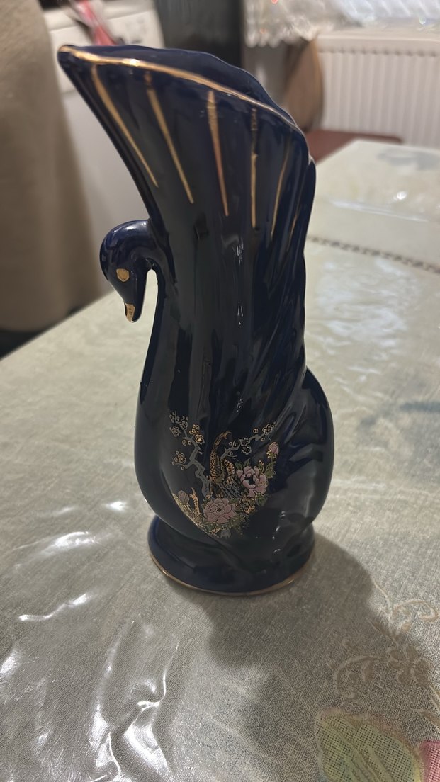 Koyu mavi renkte, kuğu figürlü ve zarif çiçek desenleri bulunan dekoratif vazo.