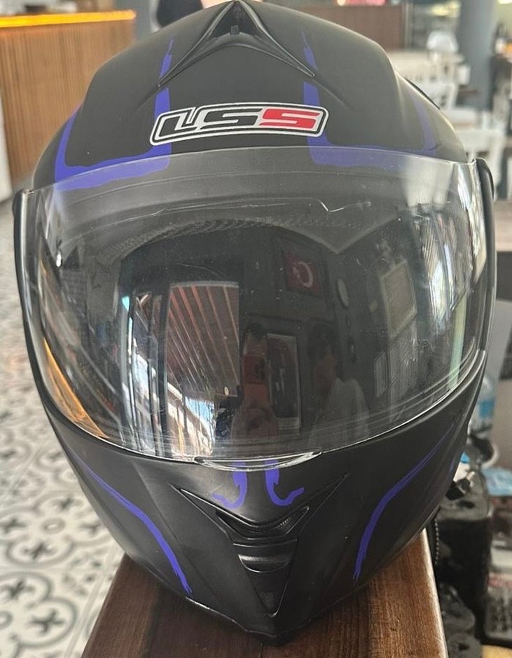 Koyu mavi renkte, cam vizörlü ve tokalı LS2 biker kask, rock punk sokak stiline uyum sağlar. Deformasyonu yok Sıfır gibi kullanılmıs ciziksiz hatasız LS5 L beden kask