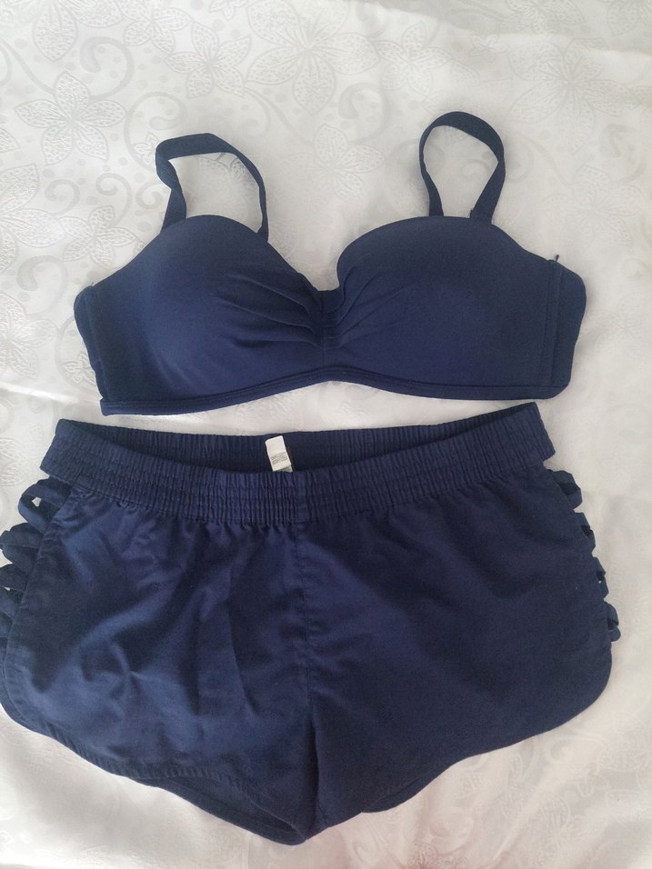 lacivert, askılı üst ve mini şortlu, vücuda oturan bikini takımı. Plaj icin. ufak tefek kusurların resimde inceleyin. renk solma yok
