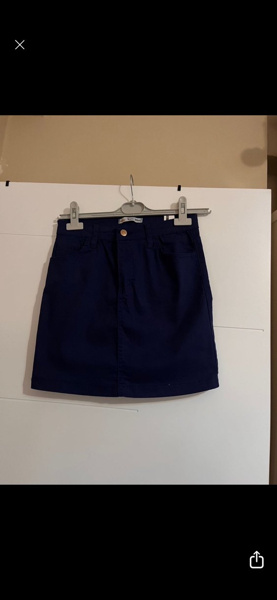 Koyu mavi mini denim etek, düz ve desensiz tasarımıyla günlük sokak stiline uyum sağlar, rahat ve şık bir görünüme sahiptir.