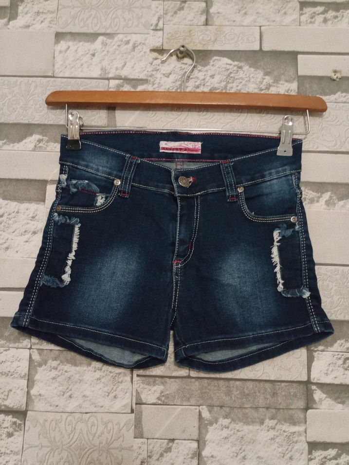 Bağcıklı detaylı, koyu mavi, bağlanmış mini kot şort, günlük sokak stiline uygun.