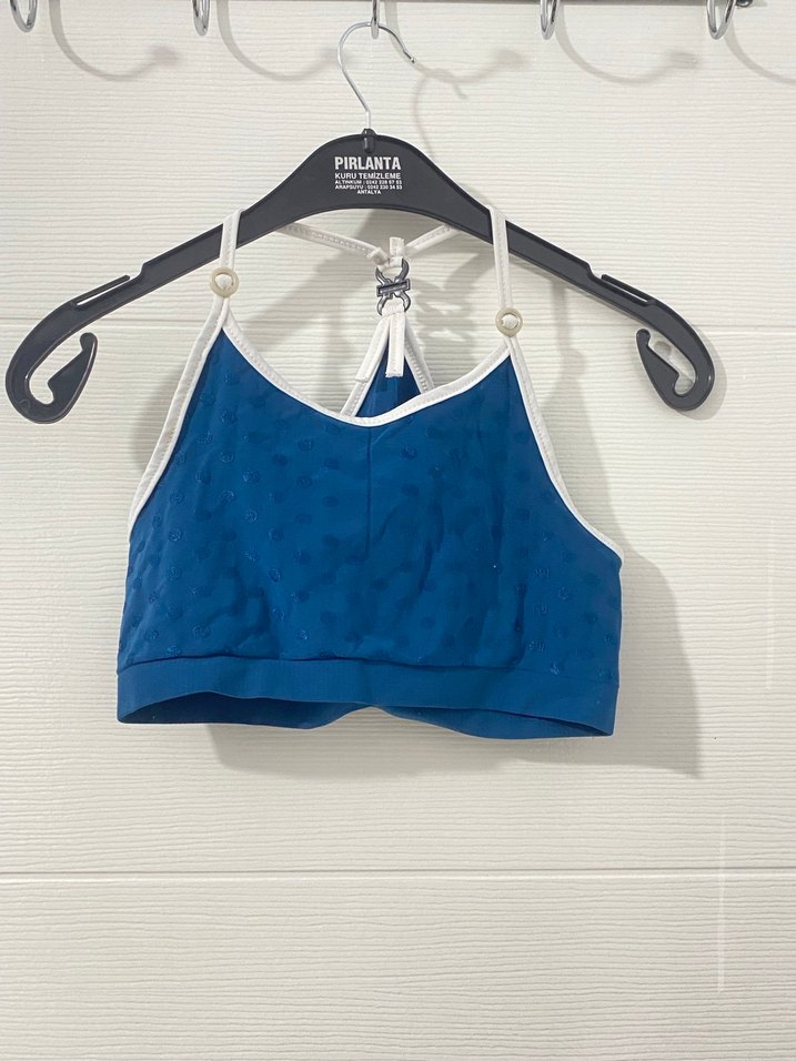 Beyaz detaylı koyu mavi mini uzunlukta, desen içermeyen spor sütyeni, sokak modasına uygun.
