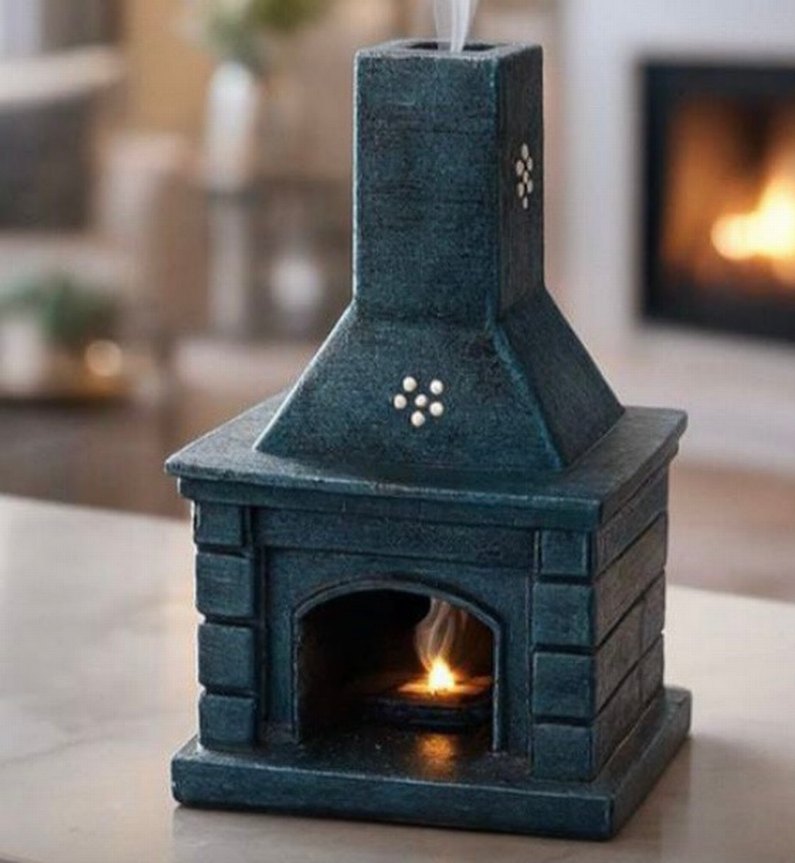 Küçük şömine şeklinde tasarlanmış, dokulu malzemeden yapılmış, küçük süs noktalarına sahip koyu mavi mumluk. ️