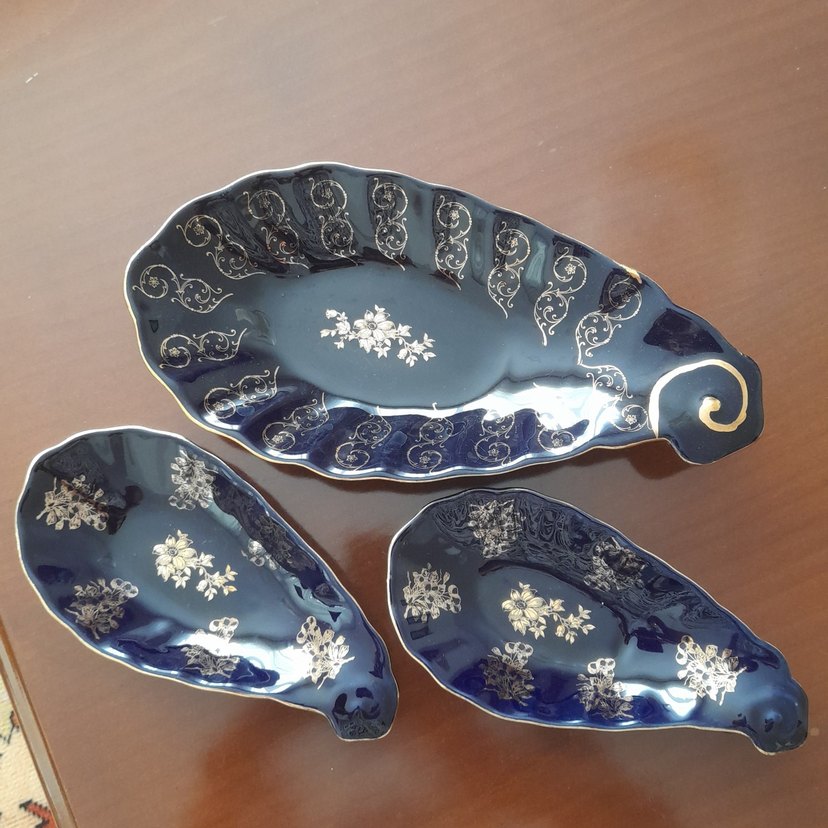 Koyu mavi renkte, nakışlı çiçek desenli ve zarif altın detaylara sahip dekoratif tabak seti. ️