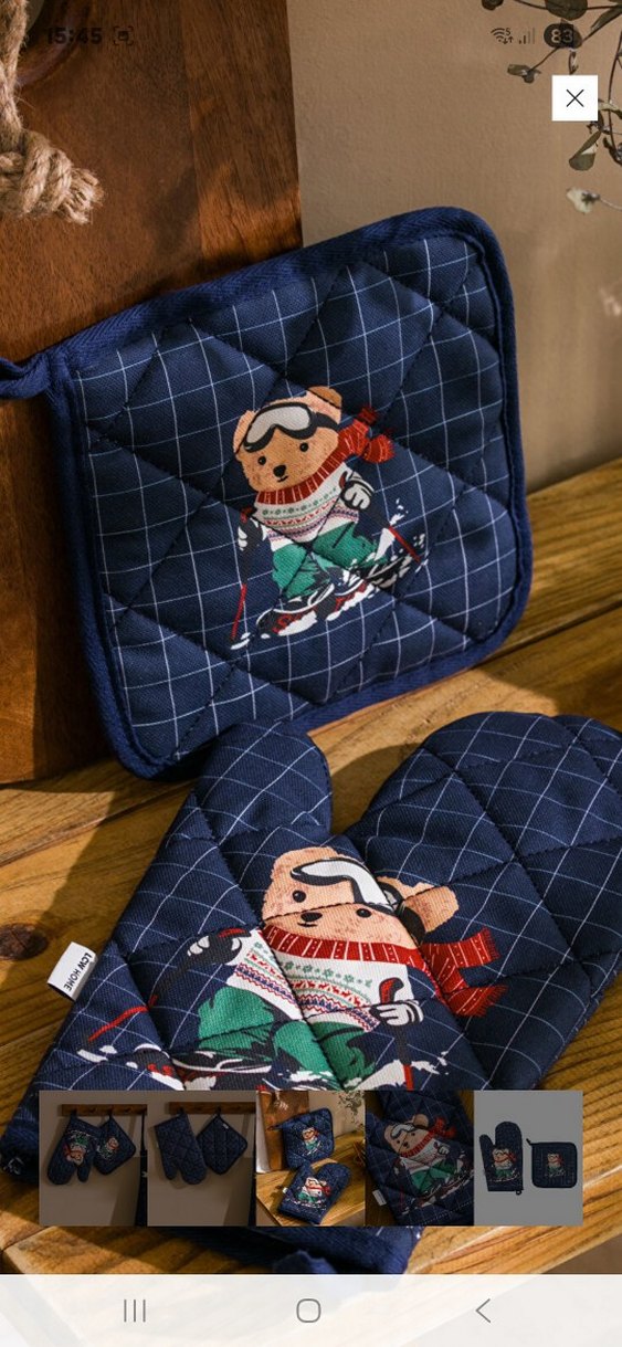 Nakışlı kayak yapan ayı figürlü koyu mavi fırın eldiveni ve tutucu seti, ısıya karşı yastıklıdır. Lcw Home sıfır etiketli üründür