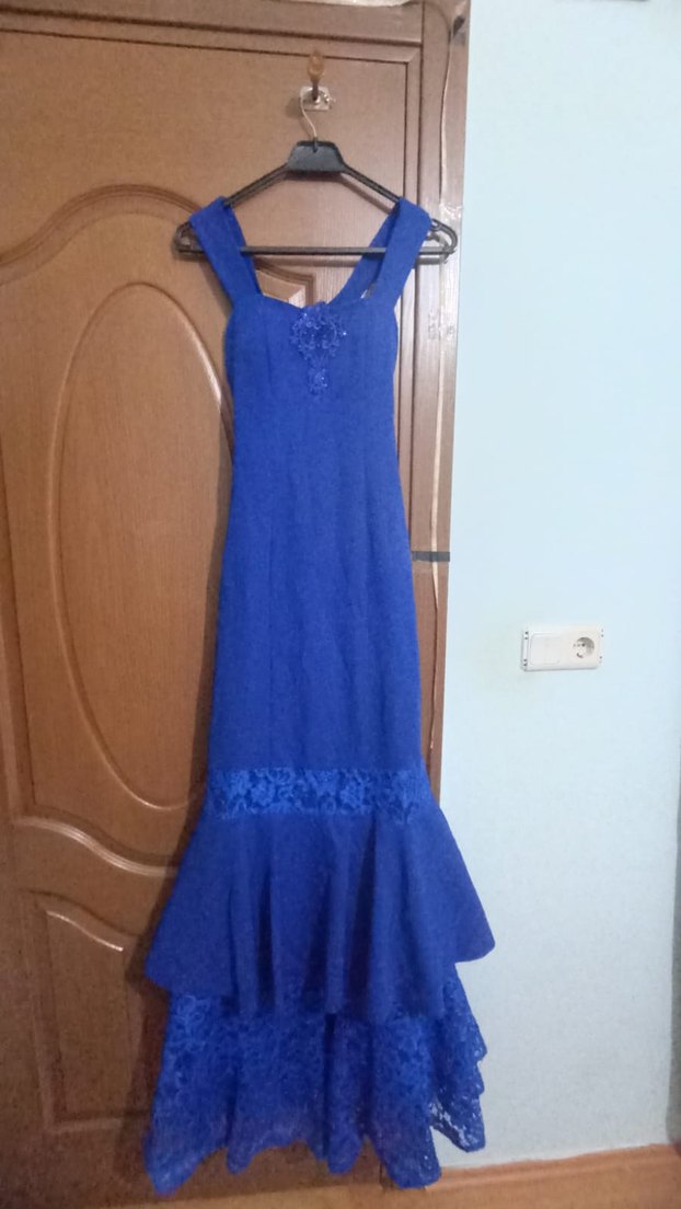 Koyu mavi nakışlı, straplez ve vücuda oturan uzun abiye elbise, vintage düğünler için uygun.